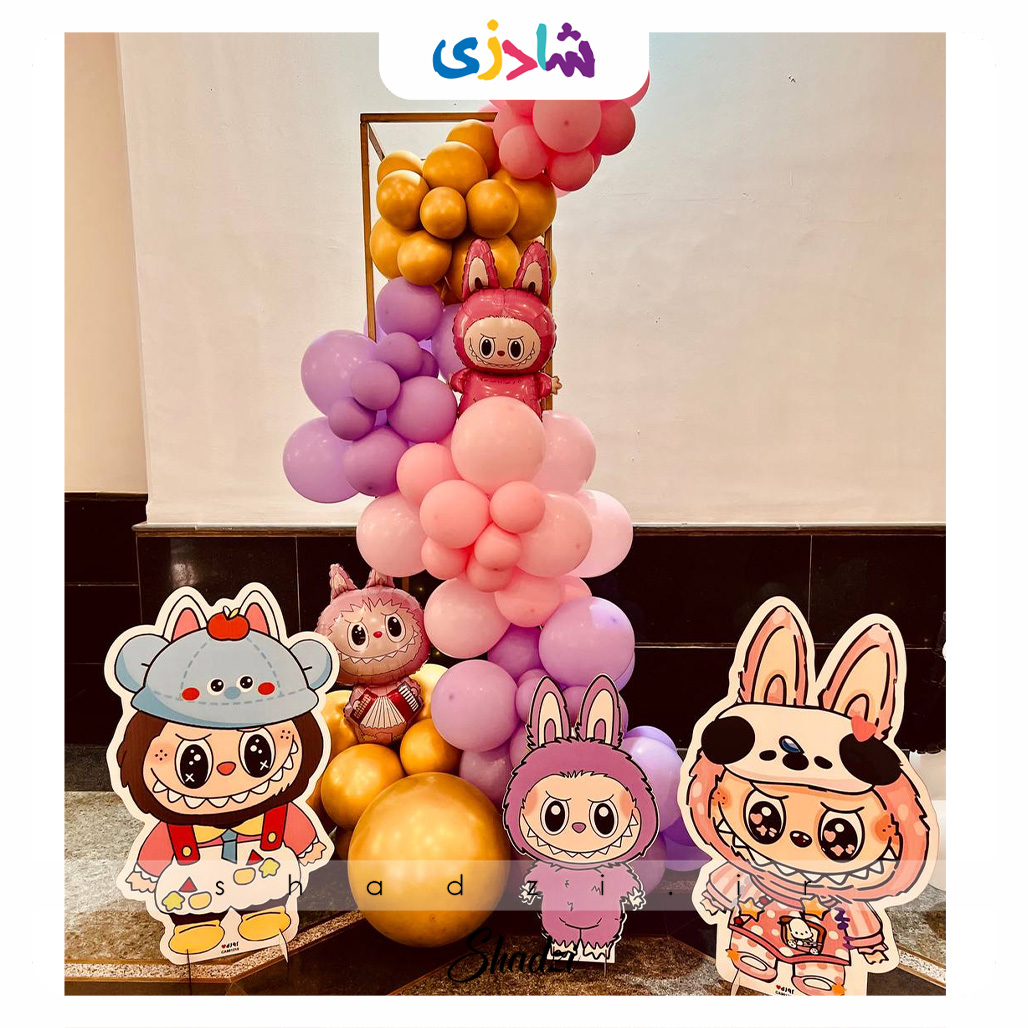 اگر بخواهیم یک بادکنک آرایی ساده داشته باشیم می توانیم مدل درختی را پیشنهاد کنیم به این صورت بادکنکها را مثل یک درخت به هم متصل می کنید یا به میله گره بزنید همچنین می توانید بادکنکهای کوچک و متوسط را به صورت کمان روی یک سازه متصل کنید و در مقابل در وردودی یا بالای میز کیک قرار دهید. بادکنک آرایی تم تولد لبوبو